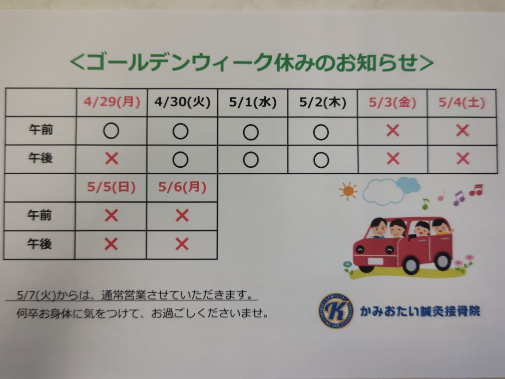 その他 【ゴールデンウィークのお休みについて】 2024.04.01 この記事のタイトルとURLをコピーする 240401091847287 kamiotai-sekkotuin Post Share Hatena Pocket RSS feedly Pin it この記事のタイトルとURLをコピーする 【肩こり】~改めて、肩こりとは??~ 前の記事 【腸脛靭帯炎(ちょうけいじんたいえん)】~ランナーは知っておきたい!~ 次の記事