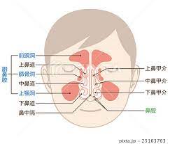 鼻の内部を鼻腔と言い、鼻腔は中央にある鼻中隔と呼ばれる仕切りで左右に分けられています。その外側に鼻甲介が3つ(上鼻甲介、中鼻甲介、下鼻甲介)ありトンネルになっています。鼻腔周囲の顔の骨には副鼻腔と言う空洞があり(前頭洞、上顎洞、篩骨洞、蝶形骨洞)、鼻腔と繋がっています。