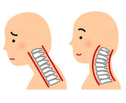 人間の首の骨は7個で構成され、横から見ると前方に向かって緩やかなカーブを描いています。(生理的弯曲)頭の重さは成人でだいたい体重の10%と言われます。首のカーブがあるおかげで頭の重みを分散させ衝撃を和らげることができます。下を向くなどの動作は首のカーブを減少させストレートネックにさせます。下を向けば向くほど首への負担は大きく加わります。